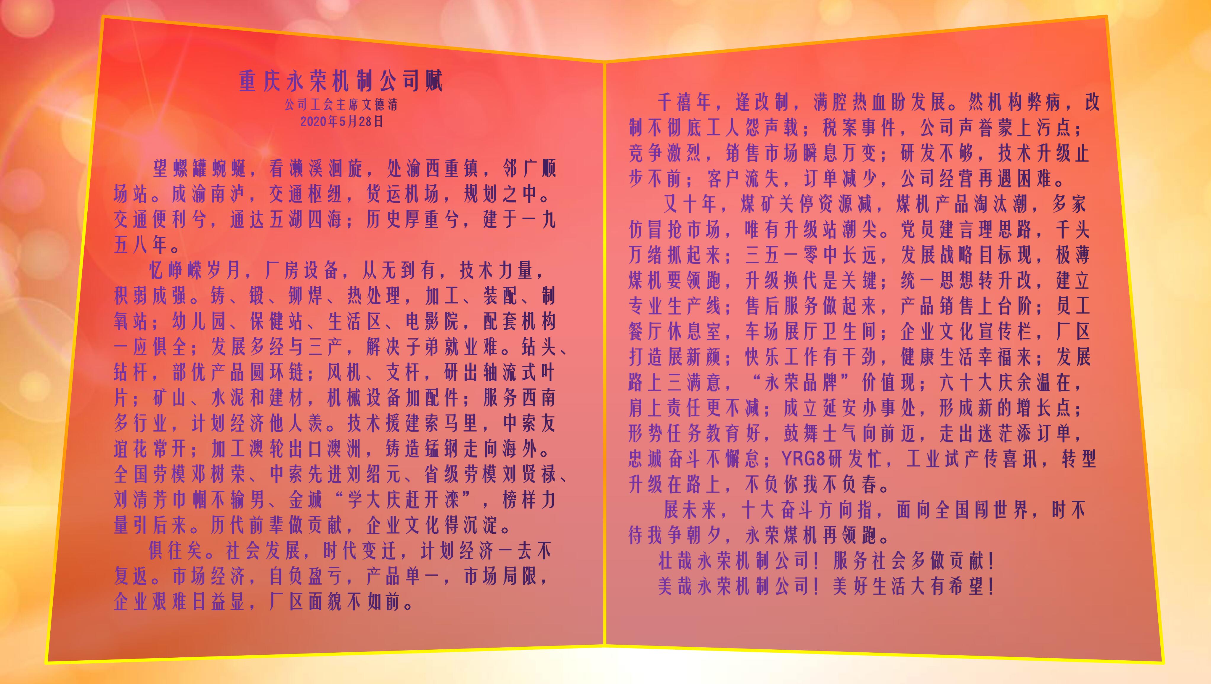 又十年,煤礦關(guān)停資源減,煤機(jī)產(chǎn)品淘汰潮,多家仿冒搶市場,唯有升級站潮尖。黨員建言理思路,千頭萬緒抓起來;三五一零中長遠(yuǎn),發(fā)展戰(zhàn)略目標(biāo)現(xiàn),極薄煤機(jī)要領(lǐng)跑,升級換代是關(guān)鍵;統(tǒng)一思想轉(zhuǎn)升改,建立專業(yè)生產(chǎn)線;售后服務(wù)做起來,產(chǎn)品銷售上臺階;員工餐廳休息室,車場展廳衛(wèi)生間;企業(yè)文化宣傳欄,廠區(qū)打造展新顏;快樂工作有干勁,健康生活幸福來;發(fā)展路上三滿意,“永榮品牌”價(jià)值現(xiàn);六十大慶余溫在,肩上責(zé)任更不減;成立延安辦事處,形成新的增長點(diǎn);形勢任務(wù)教育好,鼓舞士氣向前邁,走出迷茫添訂單,忠誠奮斗不懈??;YRG8研發(fā)忙,工業(yè)試產(chǎn)傳喜訊,轉(zhuǎn)型升級在路上,不負(fù)你我不負(fù)春。