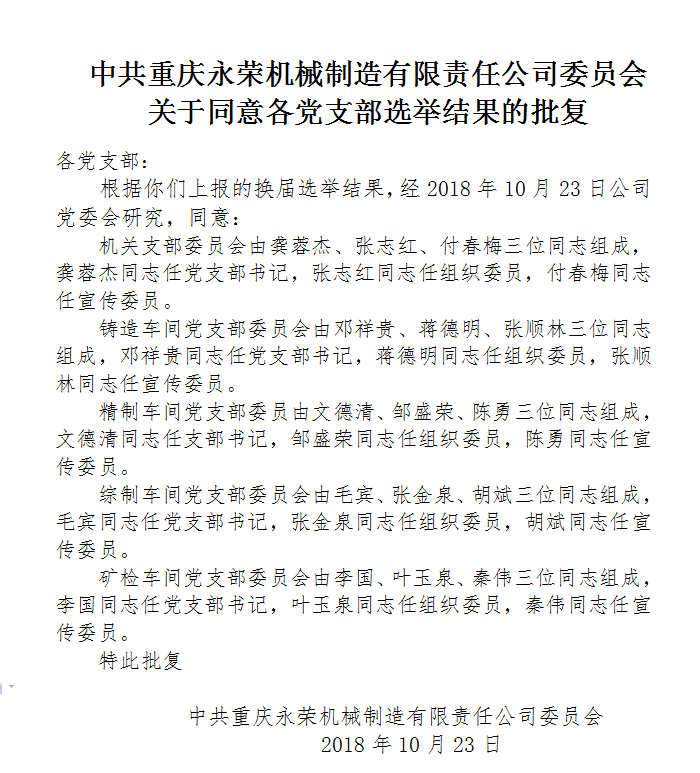 10月,永榮機(jī)制公司黨委下屬五個黨支部兩年任期屆滿,按照相關(guān)規(guī)定,各支部分別召開黨員大會進(jìn)行換屆選舉。截至10月底,各黨支部順利完成選舉任務(wù)。圖為選舉結(jié)果。